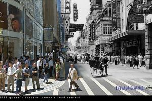 右方皇后戲院,一九一一年建成,前身是香港映畫戲院,一九二四年改名。日治期間,改名明治劇場。一九九五年,改為迷你戲院。二零零七年,皇后戲院拆卸,改建為陸海通大廈。Kent Mak製作